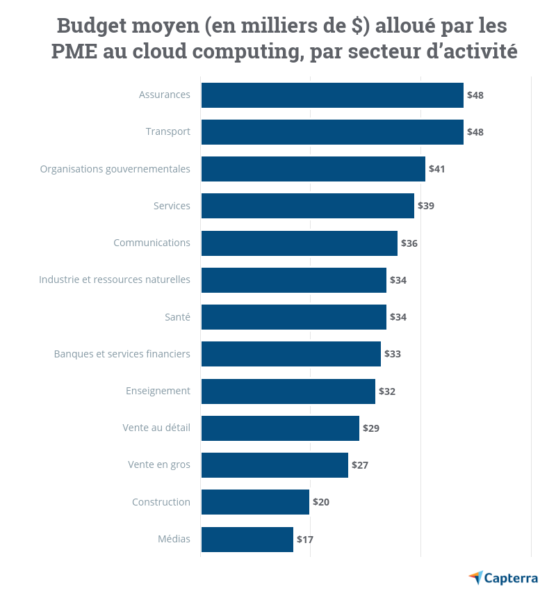 Les compagnies d’assurances, les sociétés de transport et les organisations gouvernementales prévoient de consacrer en moyenne 40 000 dollars aux technologies cloud (voir Figure 9).