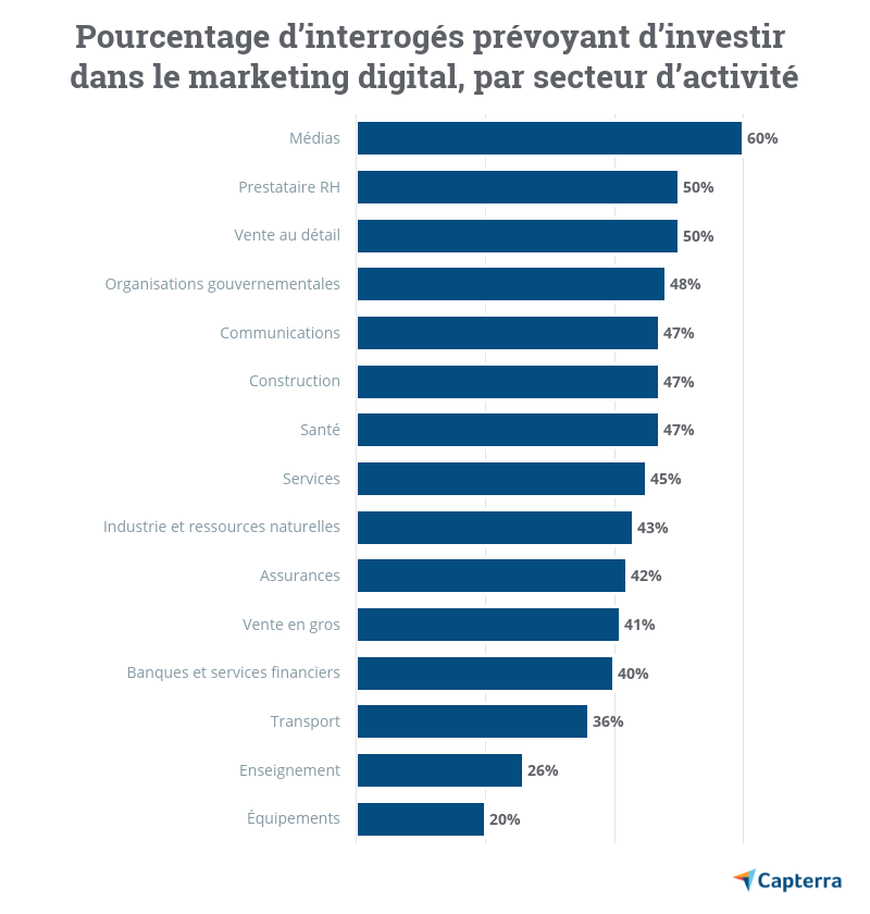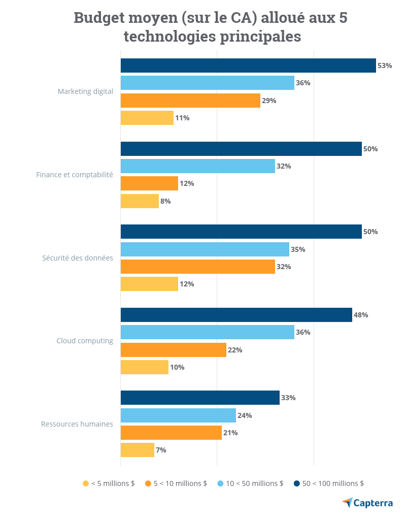 L’intention de consacrer une part de son budget au marketing digital est assez constante dans tous les secteurs et dans tous les types d’entreprises, mais les sommes réellement allouées à ce genre de logiciels varient fortement.
