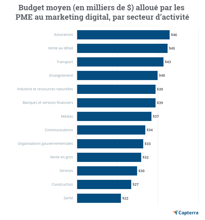 - Si vous dirigez une entreprise de taille moyenne dans ces secteurs, prévoyez de dépenser entre 35 000 et 45 000 dollars en e-marketing dans les 12 à 24 prochains mois.