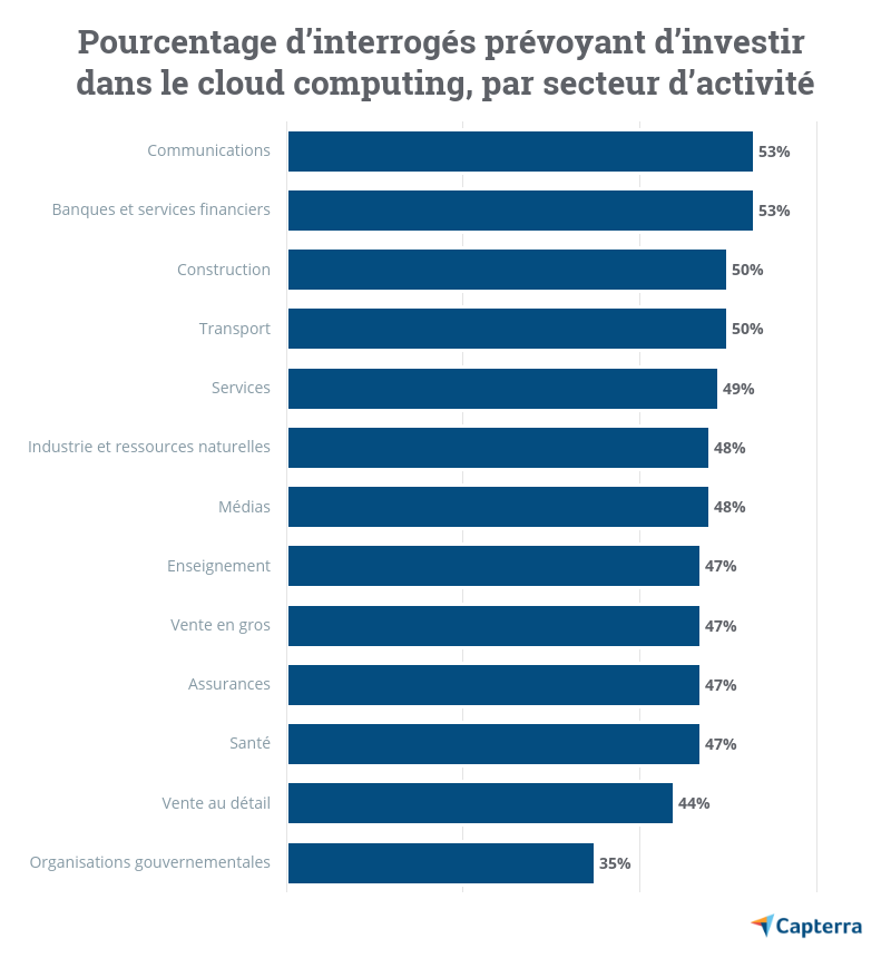Entre 45 et 55 % des répondants issus de presque tous les secteurs comptent investir dans le cloud computing (voir Figure 8).